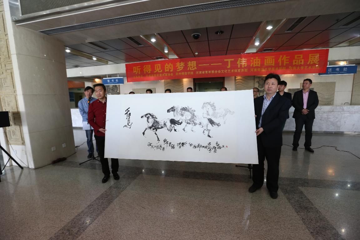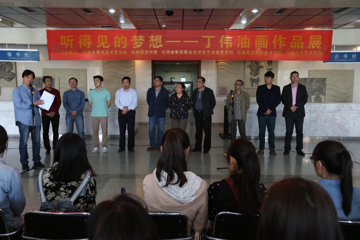 5月12日上午,我校在图书馆举办“听得见的梦想—丁伟油画作品展”开幕式。河南省青年美术家协会主席、省青年联合会文化艺术体育界别主任石贵州,河南油画研究会秘书长曹天,校党委书记于向英、副校长贾敏仁以及团省委、兄弟院校领导等专家学者出席了活动。